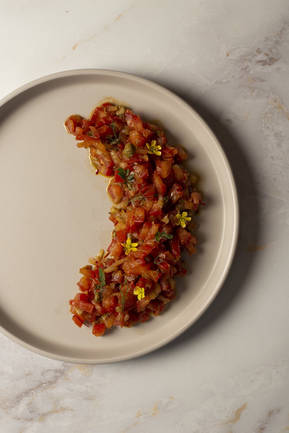 Mix in the olive oil, mustard, Worcestershire, oregano, few strands of Safinter saffron and Tabasco sauce in with the tomatoes and season to taste with salt. Let the mixture chill for 30 minutes before serving.