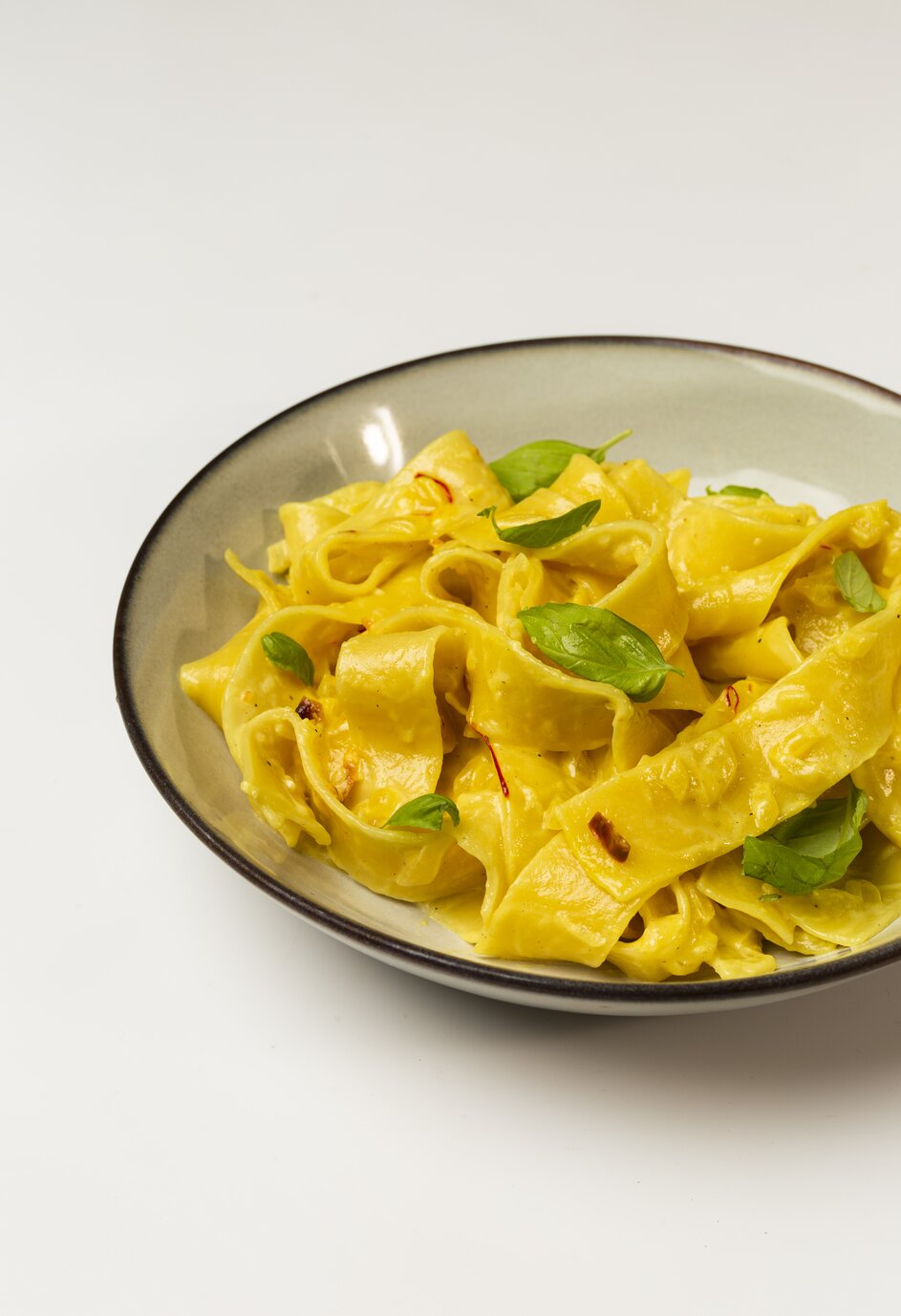 Add cooked pasta, reserved pasta water and ¼ cup butter and toss to coat. Then add ½ cup Grated Parmesan and toss again. Garnish with more saffron and basil if you'd like.