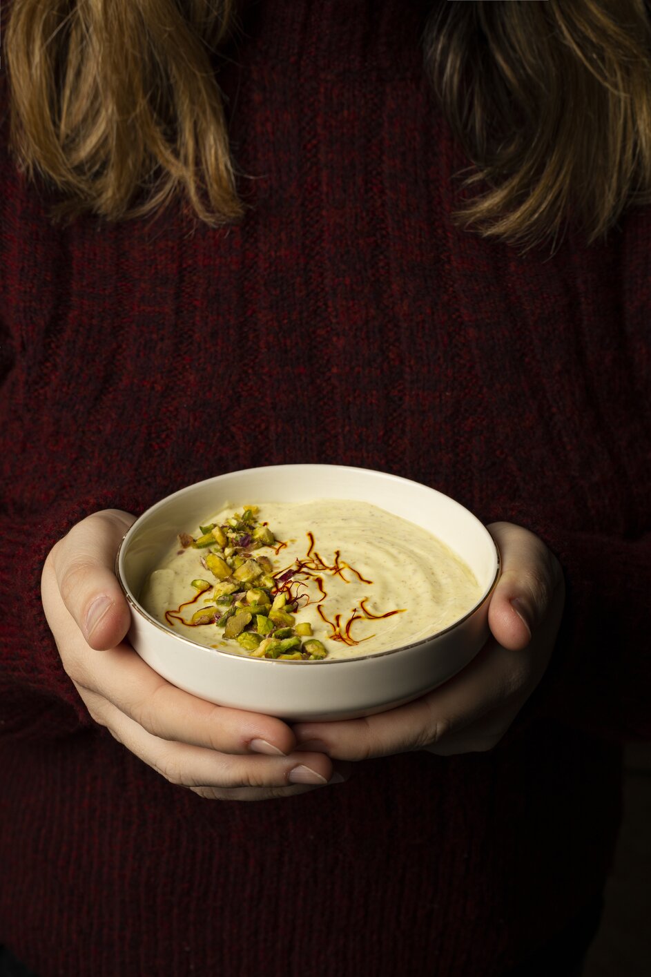 After the yogurt drains, warm the milk in the microwave for 10 to 15 seconds. Then add Safinter saffron and allow it to bloom.