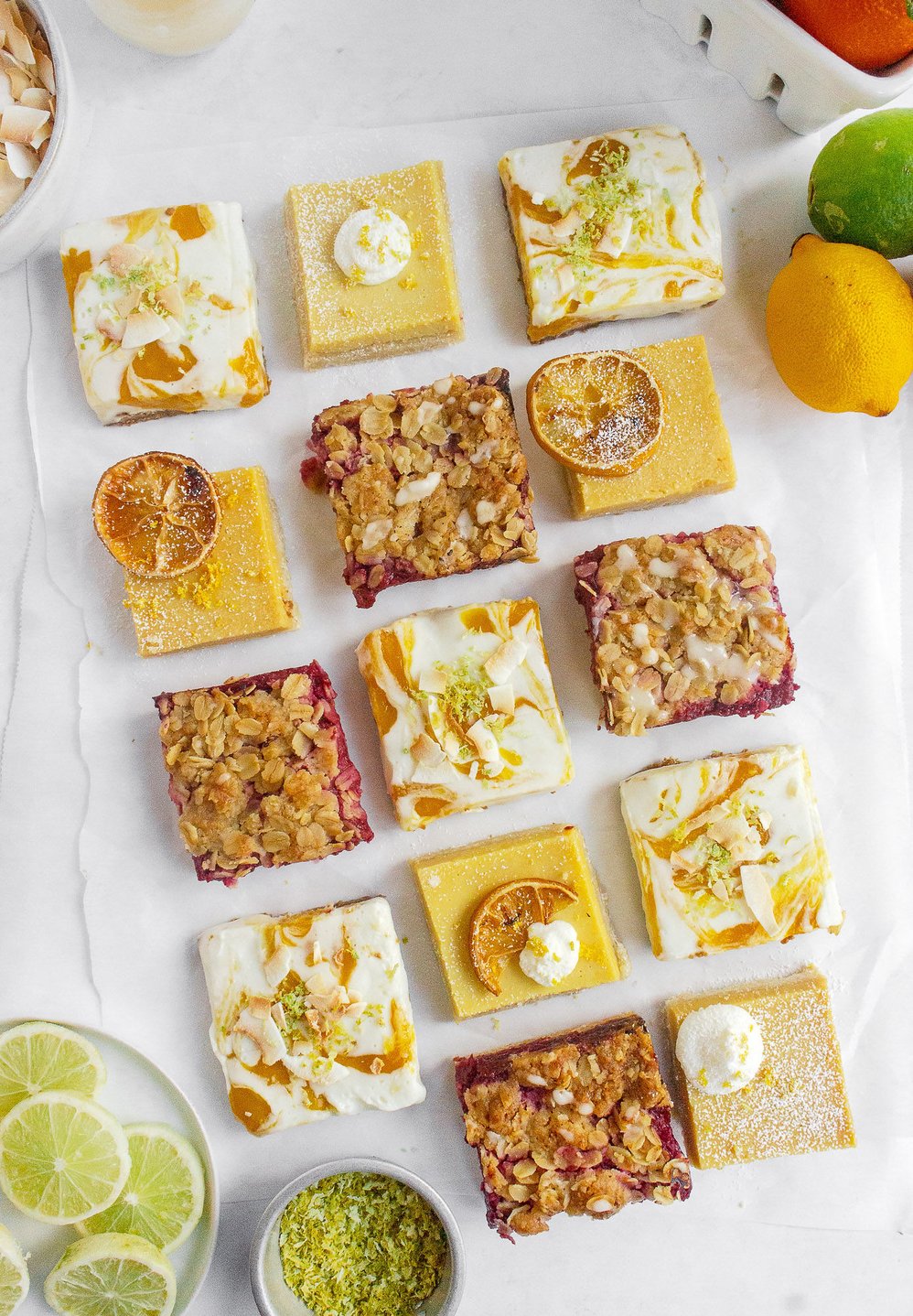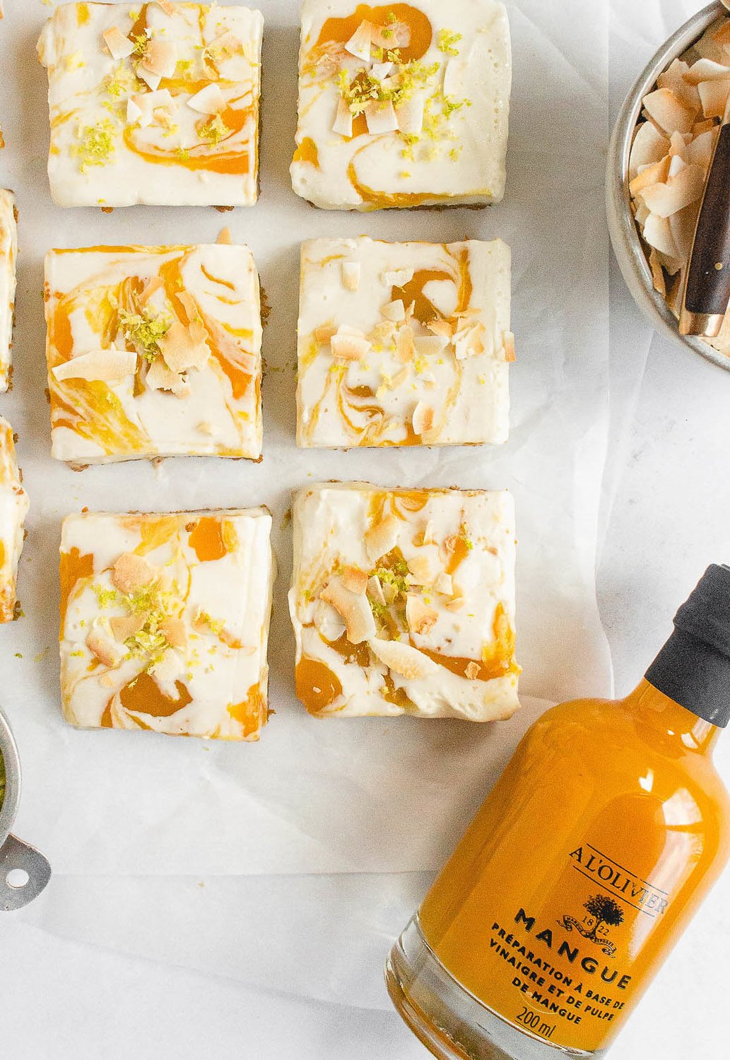 We used A L'Olivier fruit pulp vinegars for our collection of fruit bars. Vegan Mango Coconut Lime Bars made with Mango Fruit Pulp Vinegar and Raspberry Jam Oat Bars.