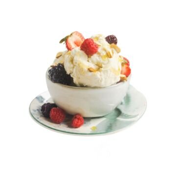 Scoop gelato alongside fresh berries and a crisp white wine.