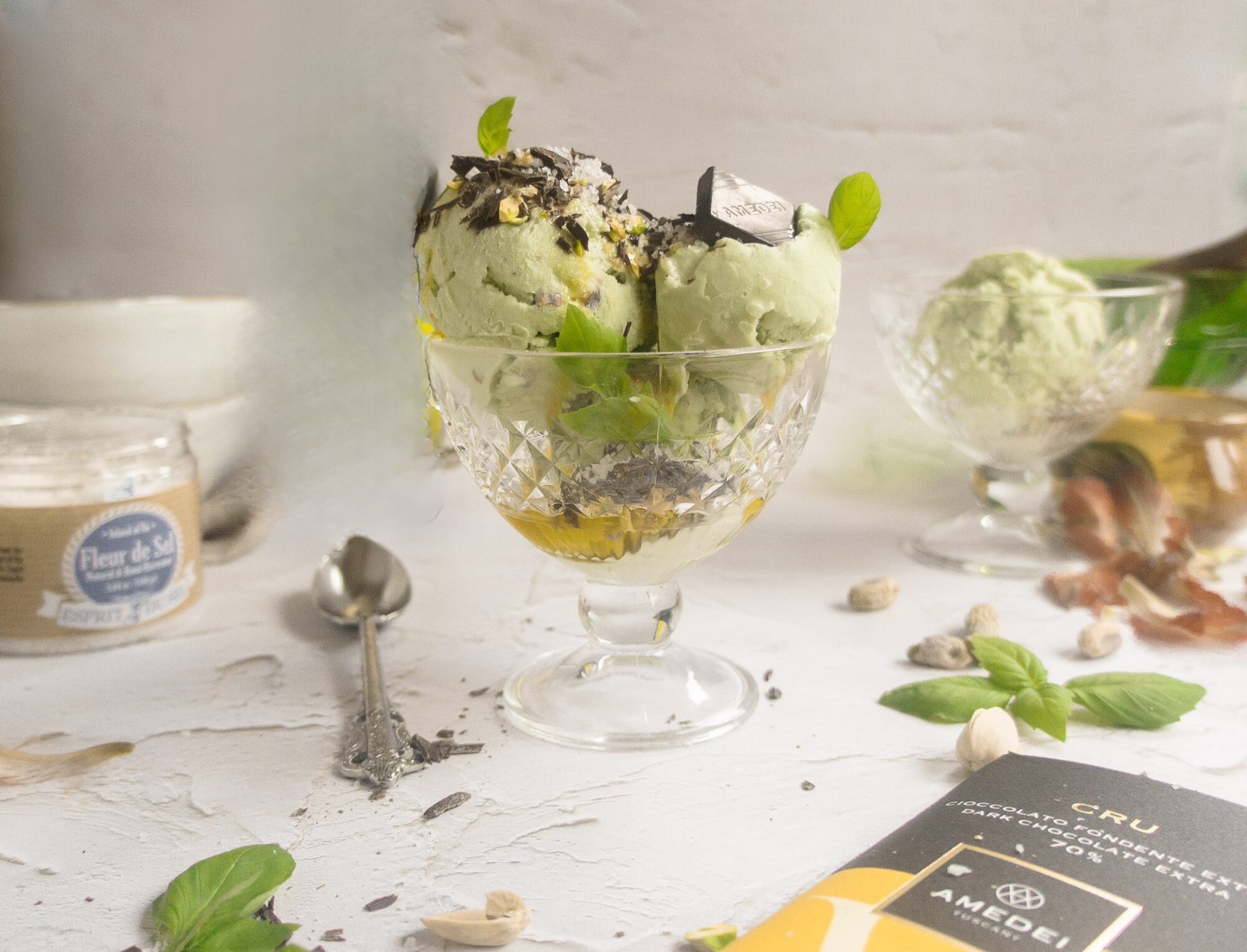 - Drizzle the oil over the gelato, garnish with the nuts, then the grated chocolate, topped off with a pinch of fleur de sel. Ecstasy!