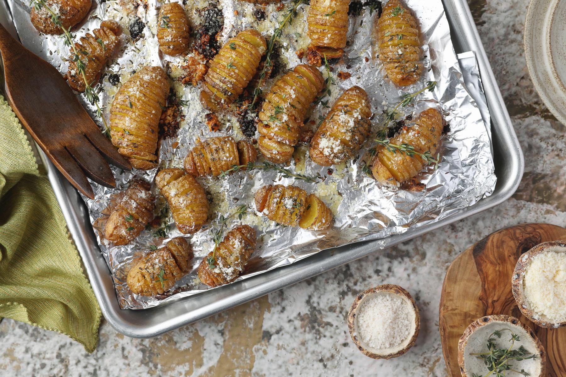 - Prepare the fingerling potatoes in hasselback style by making thin slices across each potato, ensuring not to cut completely through.